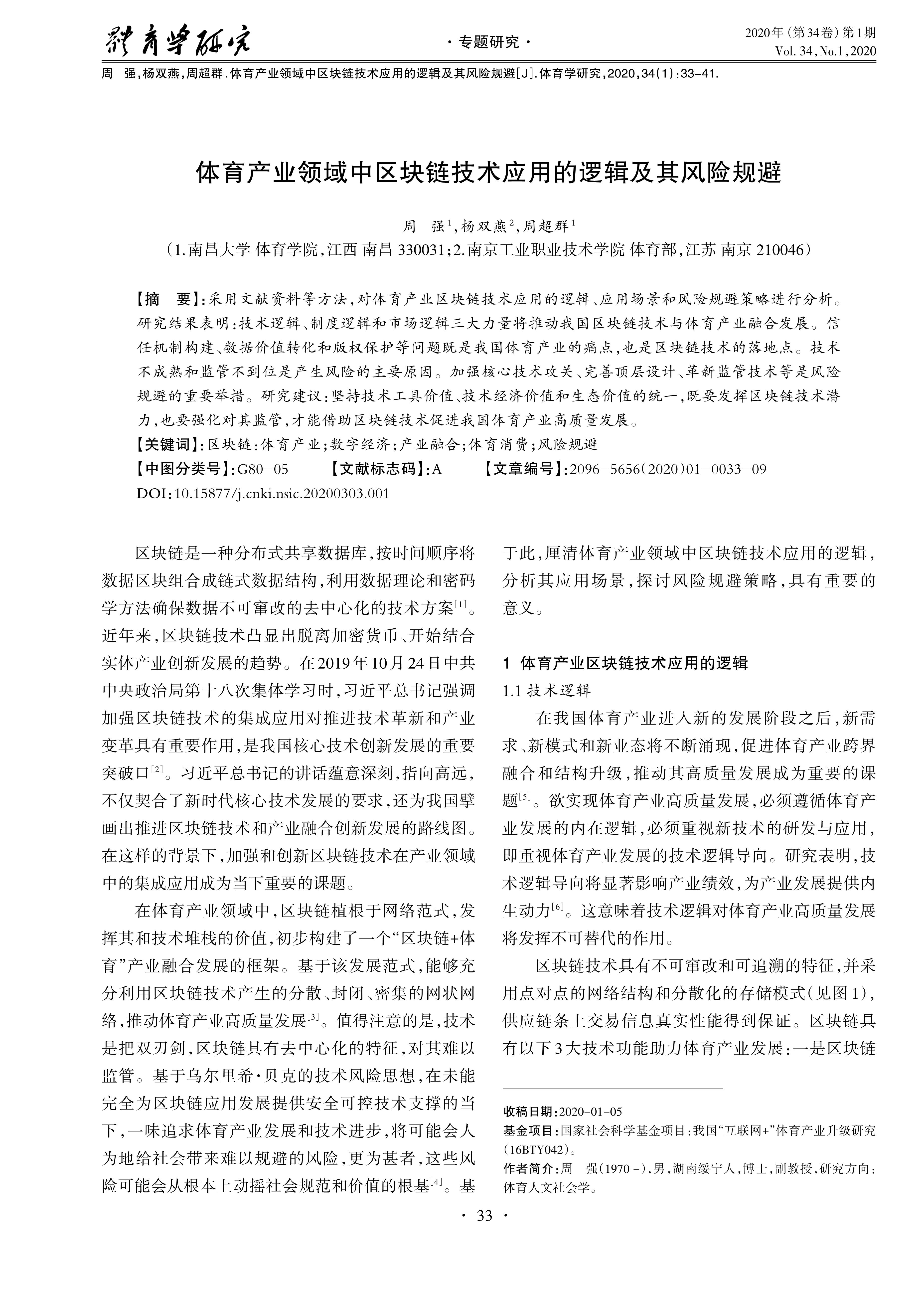 采用文献资料等方法,对体育产业区块链技术应用的逻辑、应用场景和风险规避策略进行分析。 研究结果表明:技术逻辑、制度逻辑和市场逻辑三大力量将推动我国区块链技术与体育产业融合发展。信 任机制构建、数据价值转化和版权保护等问题既是我国体育产业的痛点,也是区块链技术的落地点。技术 不成熟和监管不到位是产生风险的主要原因。加强核心技术攻关、完善顶层设计、革新监管技术等是风险 规避的重要举措。研究建议:坚持技术工具价值、技术经济价值和生态价值的统一,既要发挥区块链技术潜 力,也要强化对其监管,才能借助区块链技术促进我国体育产业高质量发展。