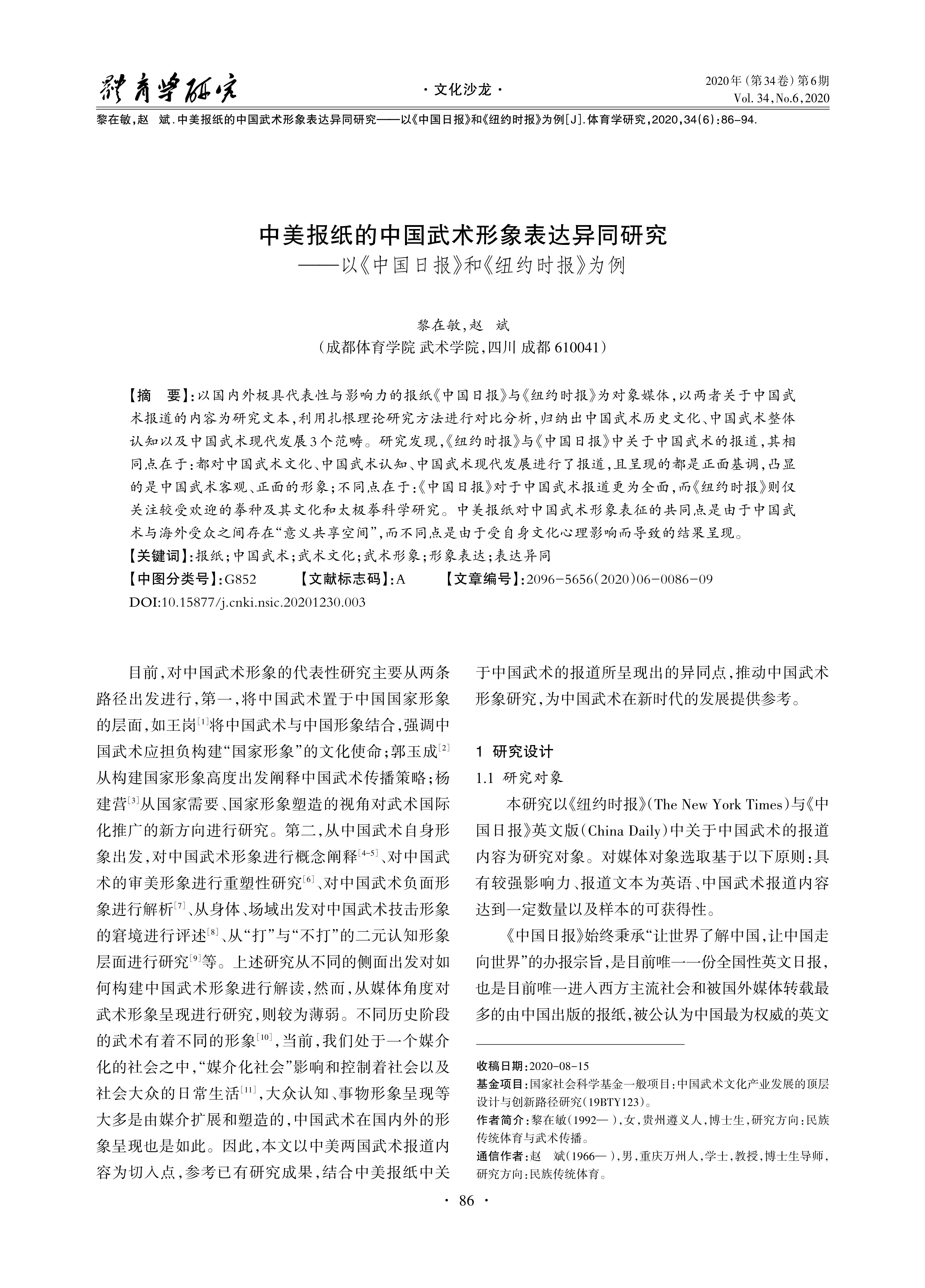 Taking the representative and influential newspapers of China Daily and The New York Times as target media, choosing the contents of Chinese martial arts reports in the two newspapers as the research samples. This paper used the grounded theory research method for comparative analysis and summed up. Three categories including the historic culture,the overall cognition,and the modern development of Wushu. It found that the reports on Chinese martial arts in the New York Times and China Daily were similar in that both reported the historic culture,the overall cognition,and the modern development of Chinese martial arts,and presented the positive tone,highlighting the objective and positive image of Chinese Martial Arts, The differences were that China Daily reported Martial Arts more completely and comprehensively,while The New York Times only focused on the popular boxing types and their cultures,as well as Tai Chi scientific research. The similarities in reports were due to“meaning sharing space”whereas the differences were the results of being influenced by their own cultural psychology.