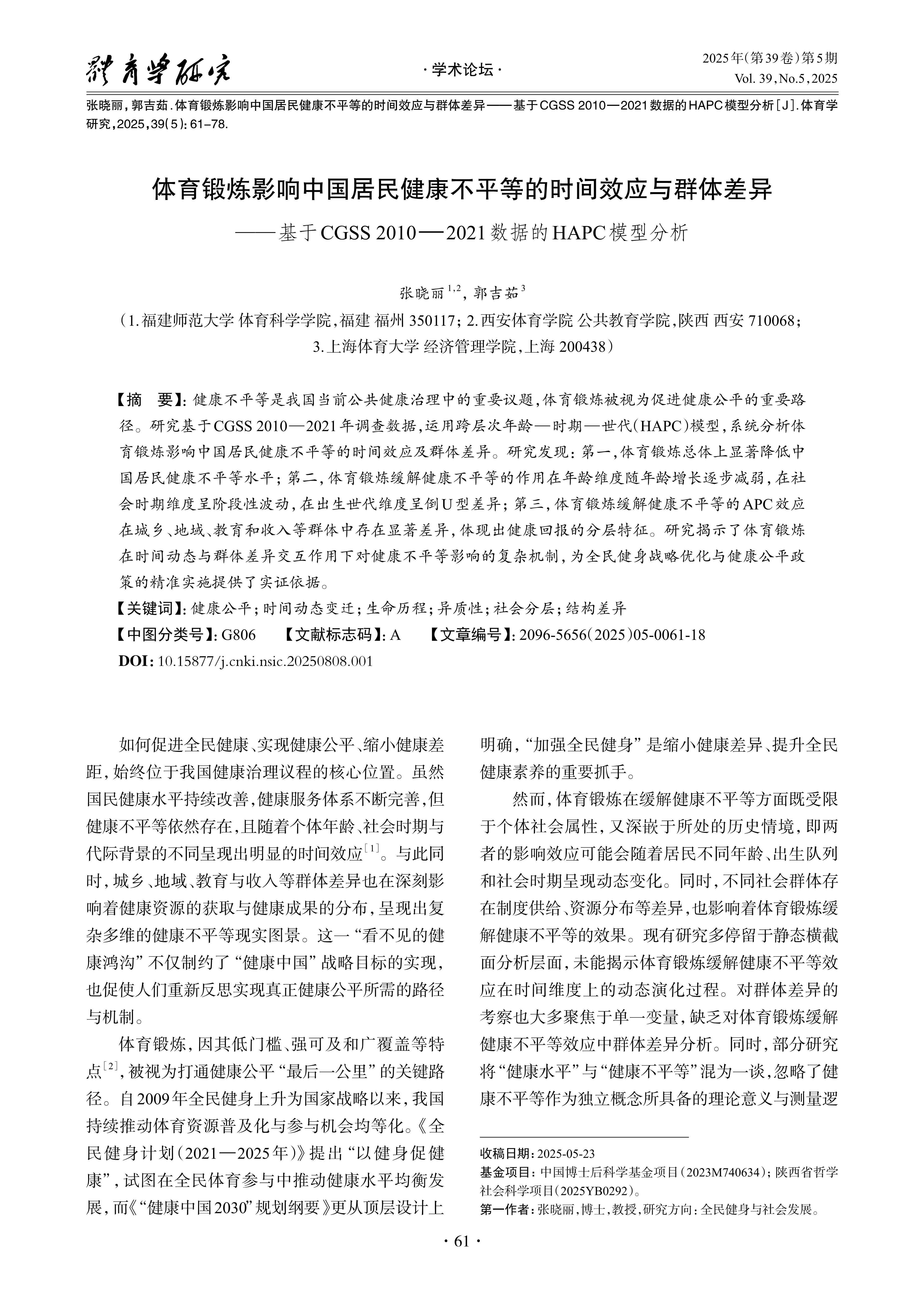 张晓丽, 郭吉茹.体育锻炼影响中国居民健康不平等的时间效应与群体差异——基于 CGSS 2010—2021 数据的 HAPC 模型分析[J].体育学研究,2025,39(5):61-78