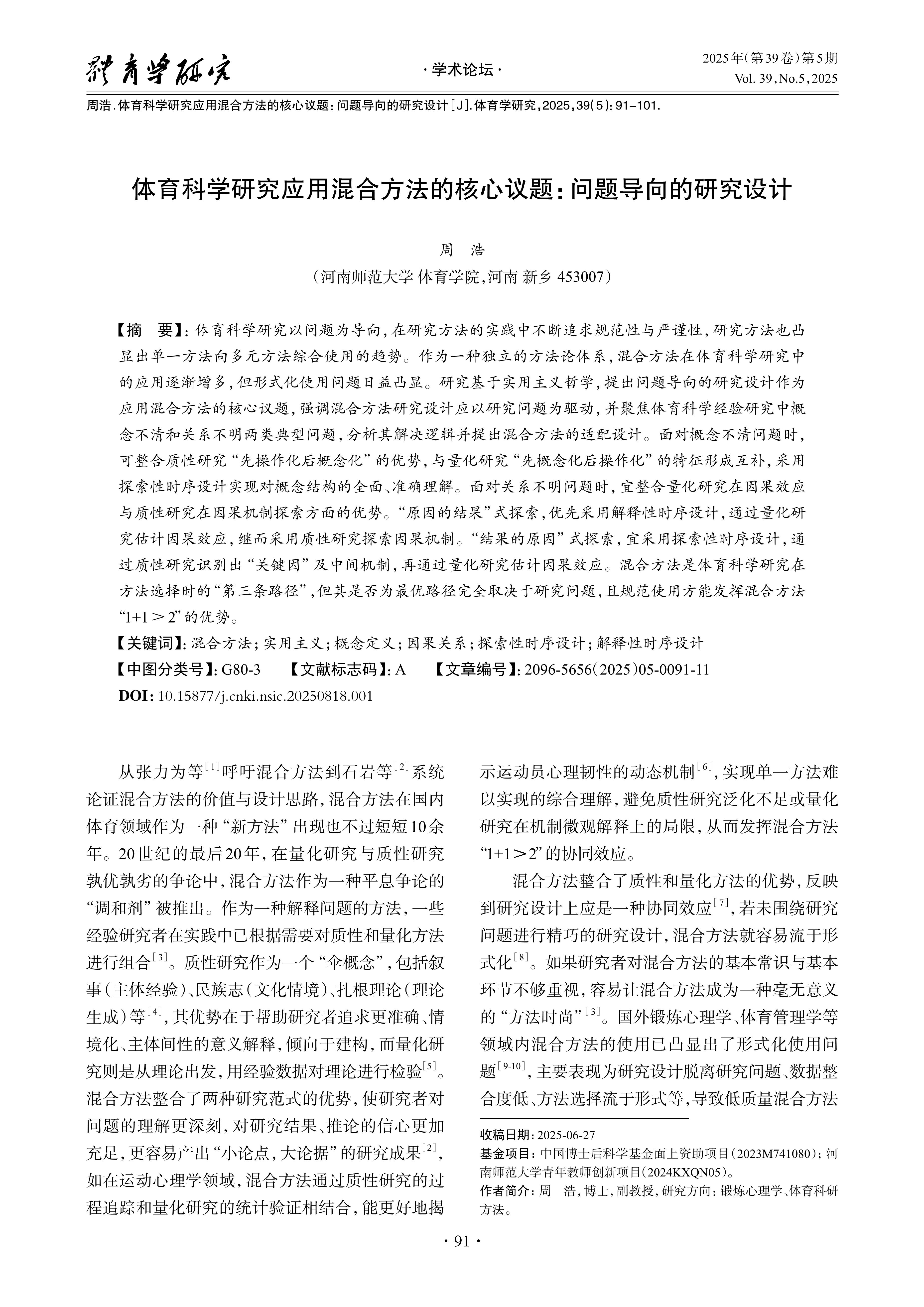 周 浩.体育科学研究应用混合方法的核心议题:问题导向的研究设计[J].体育学研究,2025,39(5):91-101