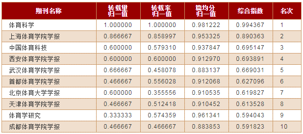 体育学学科期刊排名—综合指数排名